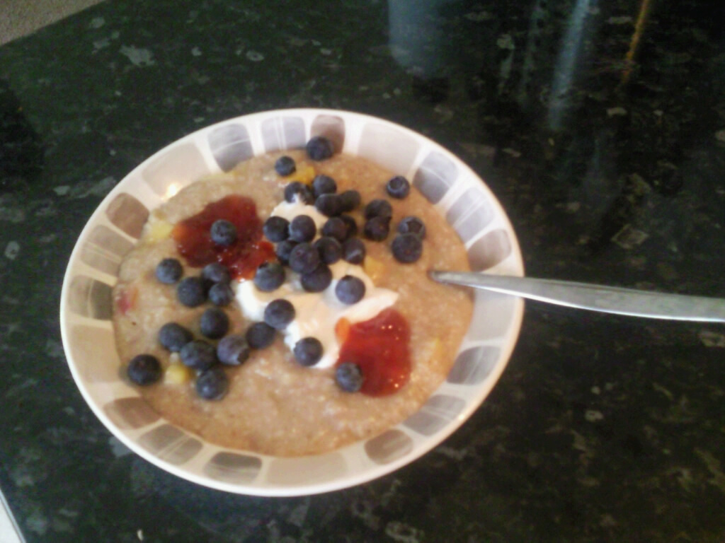 This smoothie involved a scoop of vanilla protein powder, some skimmed milk, couple of ice cubes, a frozen banana, handful of frozen summer berries and a tbsp of ground flax. I topped it with some Bear granola and fresh bluebs (swoon!). My verdict on this smoothie? Horrible, disgusting, just plain wrong... I did not like it AT ALL and had to give up half way through :( Such a tragic waste of my beloved bluebs! I knew exactly who the disgusting culprit was here: the protein powder. It gave the smoothie such a strange synthetic taste that was in no way enjoyable and left my stomach feeling dodgy for hours afterwards... definitely a protein fail.